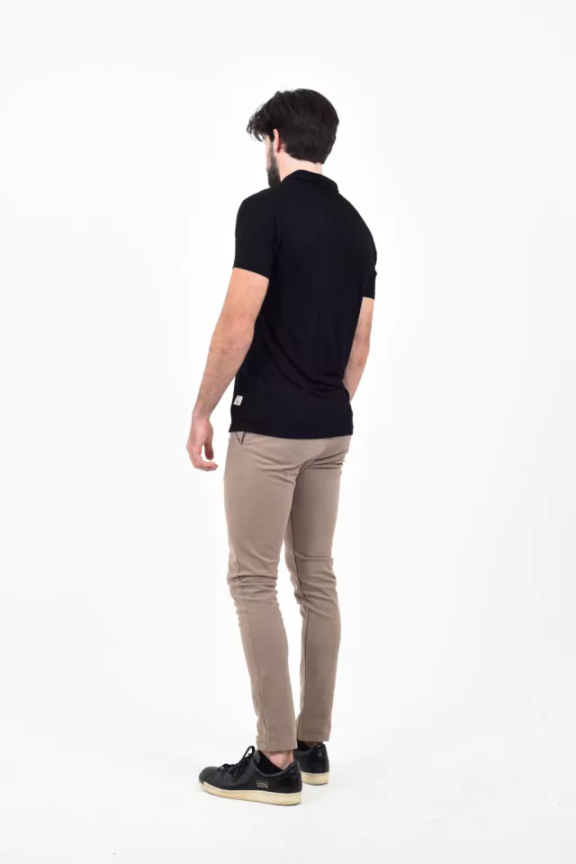 Pantalón chino, en gabardina de algodón con spandex. Presillas para cinturón, cierre de cremallera y botón metálico. Dos bolsillos laterales.