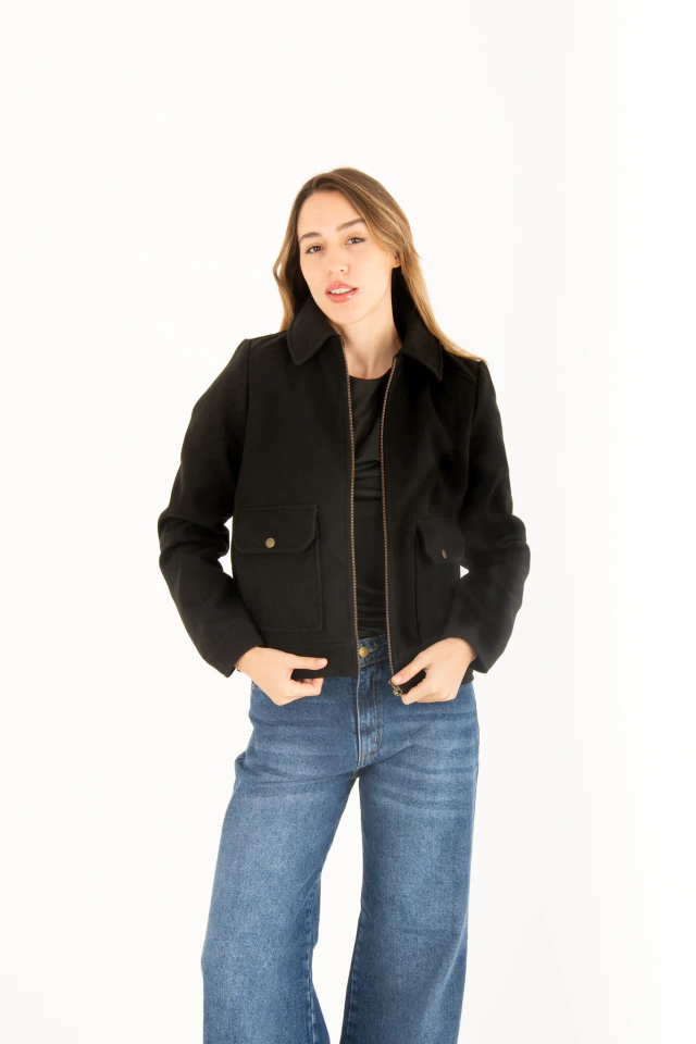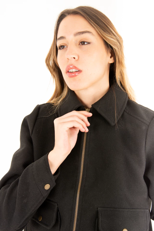 Saco de paño de mujer color negro con cierre frontal y bolsillos laterales con botones.Botón en las mangas y cuello generando una prenda mas elegante útil para cualquier look.
